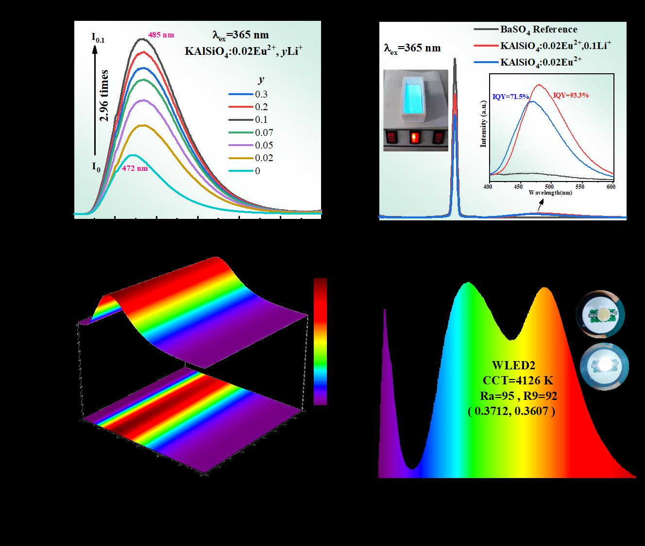 多项研究表明青色发射带由于包含蓝光和绿光,可以简化制备白色发光二极管工艺,有助于促进固态照明,因此制备能够代替传统的蓝色和绿色荧光粉的宽带青色荧光粉在制备LED技术中非常重要。本课题组采用高温固相法制备了一系列KAlSiO4:xEu2+,y Li+(工作一)和K1-xAlSiO4:xCe3+青色荧光粉(工作二)。工作一中得到,10%Li+的掺入使样品发射颜色从蓝青光调控为青光;量子产率从71.5%提高到93.3%;150℃时的发射强度从室温的75.9%提高到室温的92.7%;白光LED器件显色指数分别从82提高到95(如图1a~d所示)。工作二中得到,掺入Ce3+之后,样品具有宽的发射带,能够覆盖蓝色和绿色区域;在150℃的发光强度是室温的91.1%;LED器件的显色指数均超过90(如图2a~d所示)。本课题组通过以上两个工作制备的青色荧光粉,实现了二色发白光目的,简化了LED制备工艺,并证明了它们在未来的WLEDs照明领域中具有较好的应用前景。