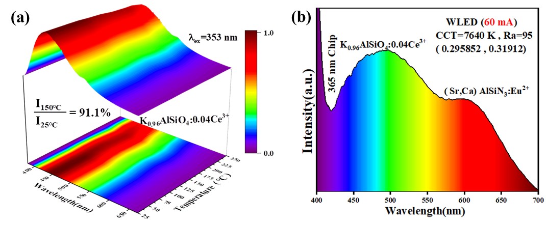 图片2 (a)K0.96AlSiO4:0.04Ce3+荧光粉的变温光谱;(b) WLED器件在60 mA电流驱动下的EL光谱图