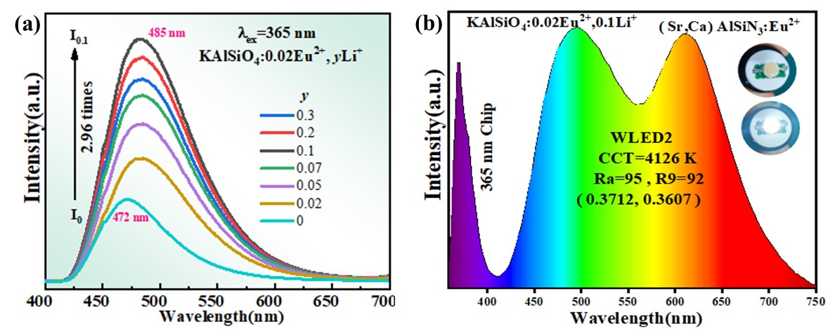 图片1 (a)KAlSiO4:0.02Eu2+, y Li+荧光粉的发射光谱; (b)使用代表样品制备的WLED器件的EL光谱图