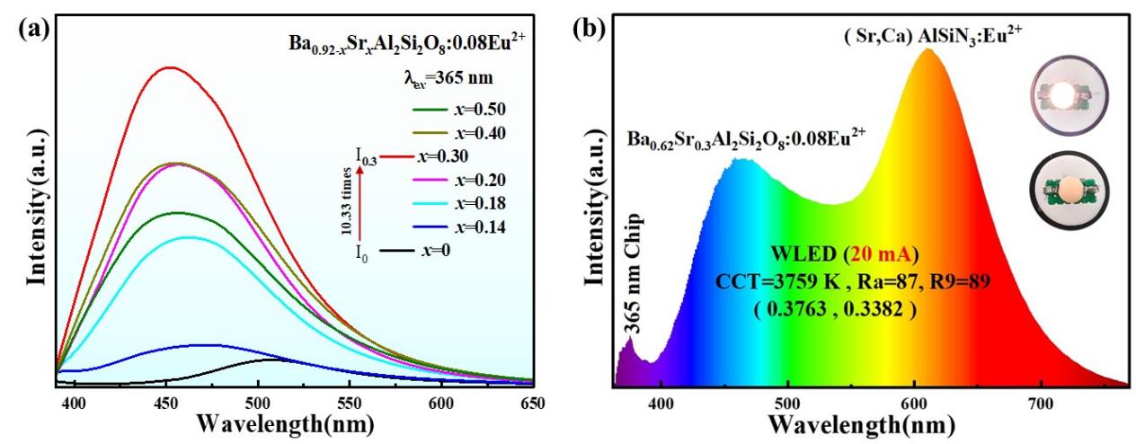 图片3 (a) Ba0.92xSrxAl2Si2O8:0.08Eu2+ (x=0~0.5)荧光粉的发射光谱;