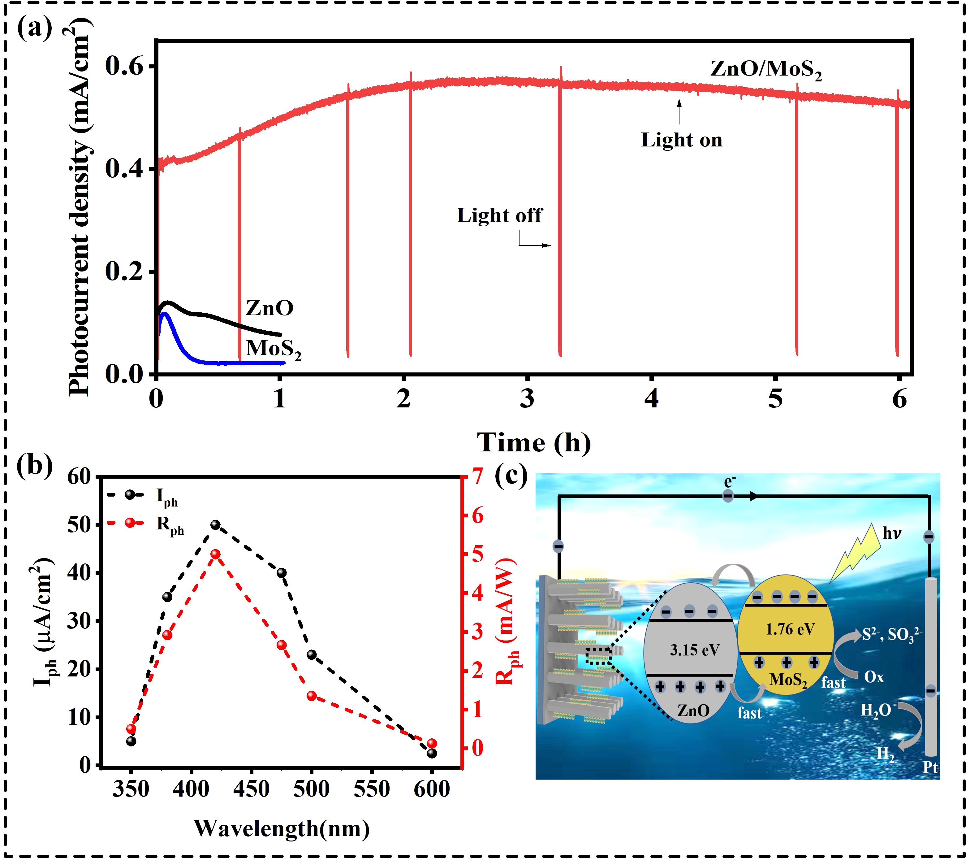 (a)ZnO、MoS2和ZnO/MoS2光阳极的PEC稳定性测试曲线;(b)ZnO/MoS2光阳极波长依赖的Iph和Rph值;(c)ZnO/MoS2光阳极电荷转移原理图。