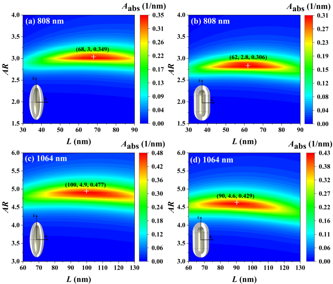 本论文以Ag@TiO2核壳纳米旋转椭球和纳米棒(图1所示)为研究对象,采用有限元法和折射率尺寸修正模型揭示了纳米颗粒光吸收特性随内核材料、内核长度和纵横比、外壳厚度、环境折射率及颗粒方位等参数的变化规律和物理机理。选取光热治疗中常用的两种激光波长808 nm(第一生物窗口)和1064 nm(第二生物窗口),对Ag@TiO2核壳纳米旋转椭球和纳米棒的内核长度和纵横比进行优化设计(图2所示)。优化后的纳米颗粒在光热治疗中可以作为理想的光热转换剂。