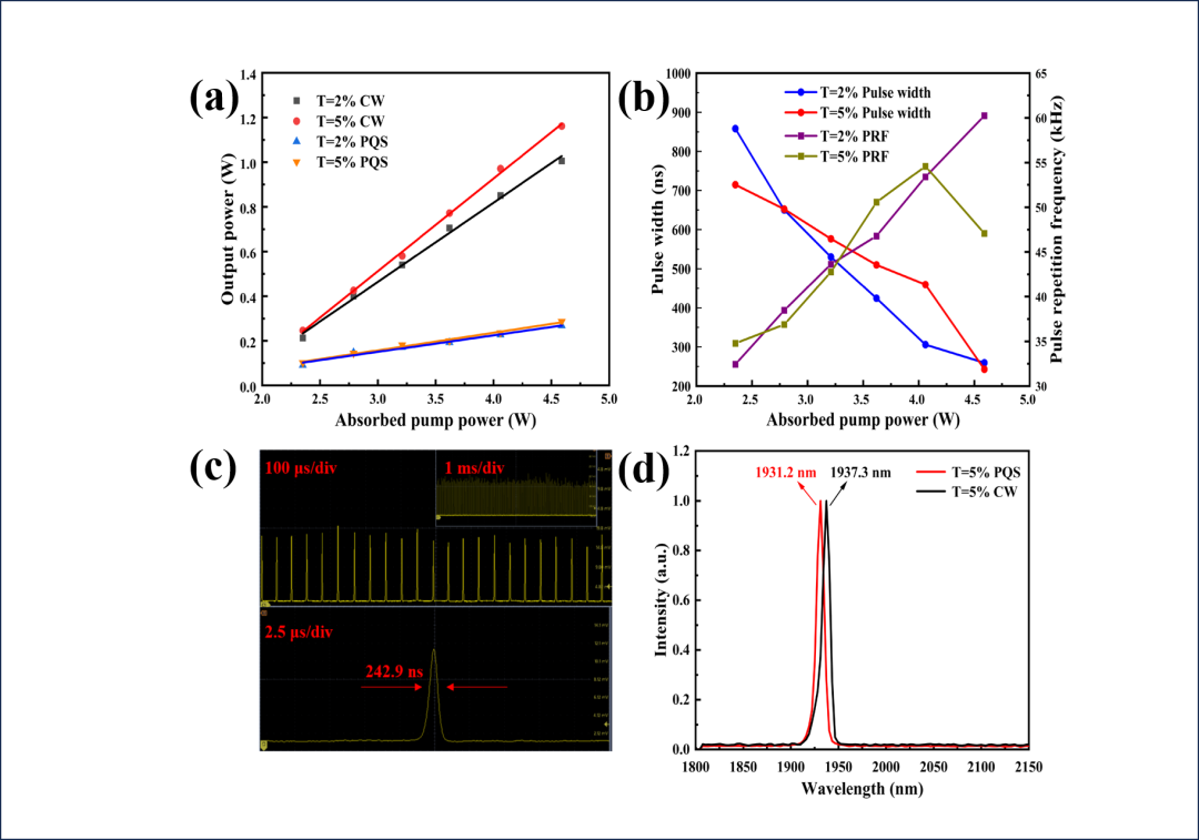 该工作采用旋涂法将一种新型MAX相陶瓷材料(Mo2TiAlC2)成功制备成被动调Q激光器的饱和吸收体(SA),并用掺铥钇铝石榴石(Tm:YAP)纳秒激光器对其非线性光学吸收特性进行了表征。在重复频率为47.07 kHz时,获得了脉冲宽度为242.9 ns的稳定激光输出,这是以MAX相材料作为SA的固体激光器中记录的最窄脉冲宽度。研究结果表明,Mo2TiAlC2 MAX相陶瓷材料在超快非线性光子学应用中具有广阔的应用前景。