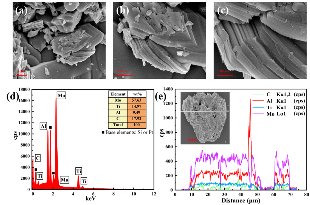 图1Mo2TiAlC2的形貌特征和成份分析. (a-c)不同放大倍数下的SEM图像;(d-e)EDS图像