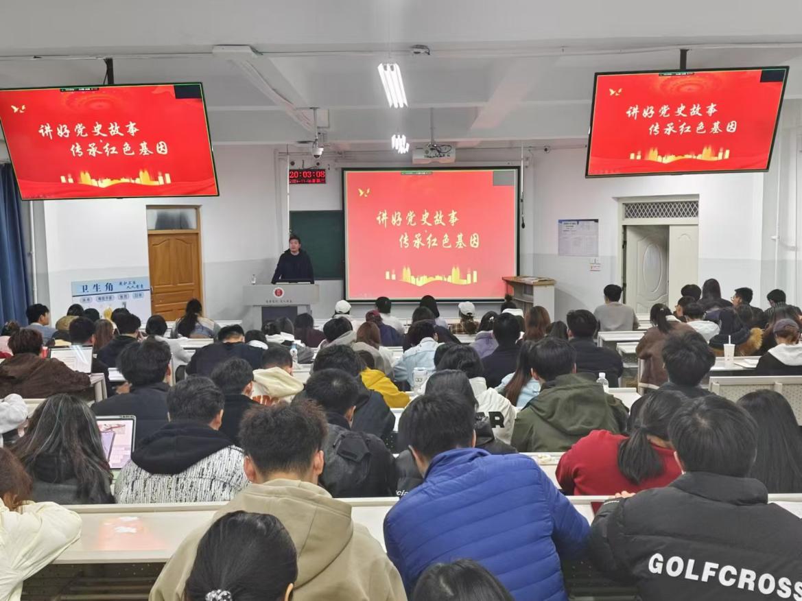 美术学院党委副科级组织员王亮以《讲好党史故事,传承红色精神》为题,通过习近平总书记近年来发表的关于我党历史的重要论述以及革命篇、抗战和解篇和建团篇等内容讲述了党史的发展及意义,并用生动形象的事例,分享了革命战士们的英勇事迹。