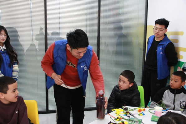 志愿者进行自我介绍,并通过“科学趣味问答”游戏与孩子们快速熟悉。让孩子们描述生活中的物理现象,在卡片上绘制“心中的科学家”形象,分享对科学的想象。