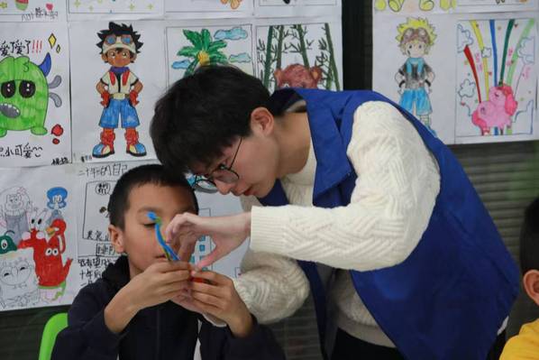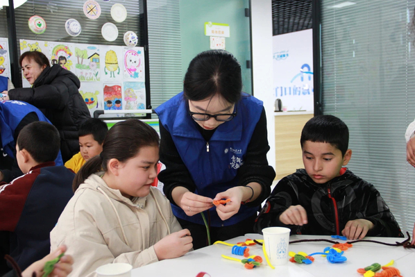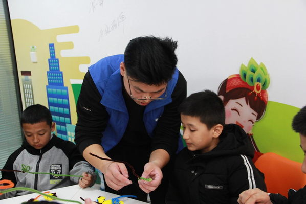 在志愿者指导下,孩子们用彩色扭扭棒制作小花与皇冠。通过观察材料的弹性与可塑性,志愿者引导孩子们思考“材料特性与生活应用”,如“为什么扭扭棒能弯曲定型?”活动不仅锻炼动手能力,更将科学思维融入艺术创作。