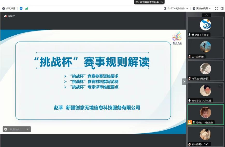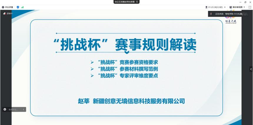 本次培训会特别邀请到生命科学学院小学教育(科学)专业学生赵莘(新疆创意无境信息科技服务有限公司总经理)为我院学生进行指导。赵莘结合自己多年的参赛经历,围绕参赛资格要求、材料撰写规范标准、评审维度要点内容和备赛过程中的实用经验,开展了具体而切合学生实际的指导。