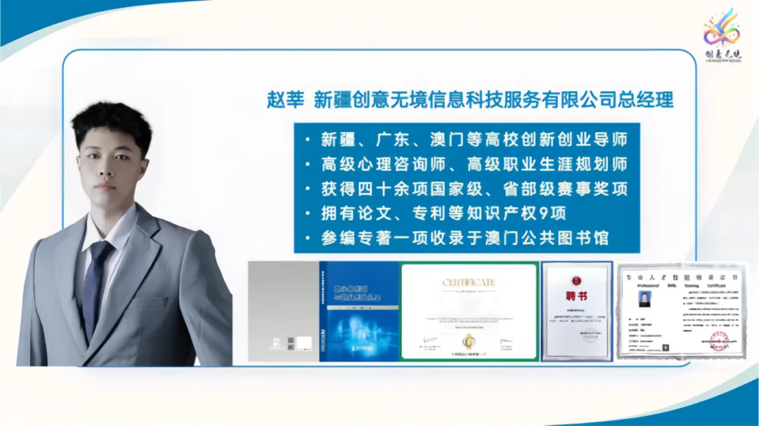 赵莘,高级心理咨询师高级职业生涯规划师,新疆创意无尽信息科科技服务有限公司总经理。连续参加四届“互联网+大赛”、两届挑战杯大赛、两届乡村振兴大赛、三创赛等多项创新创业赛事,并在各类平台上发表相关成果,曾获教育部、新疆维吾尔自治区、新疆生产建设兵团、陕西省等多项国家级与省级表彰。
