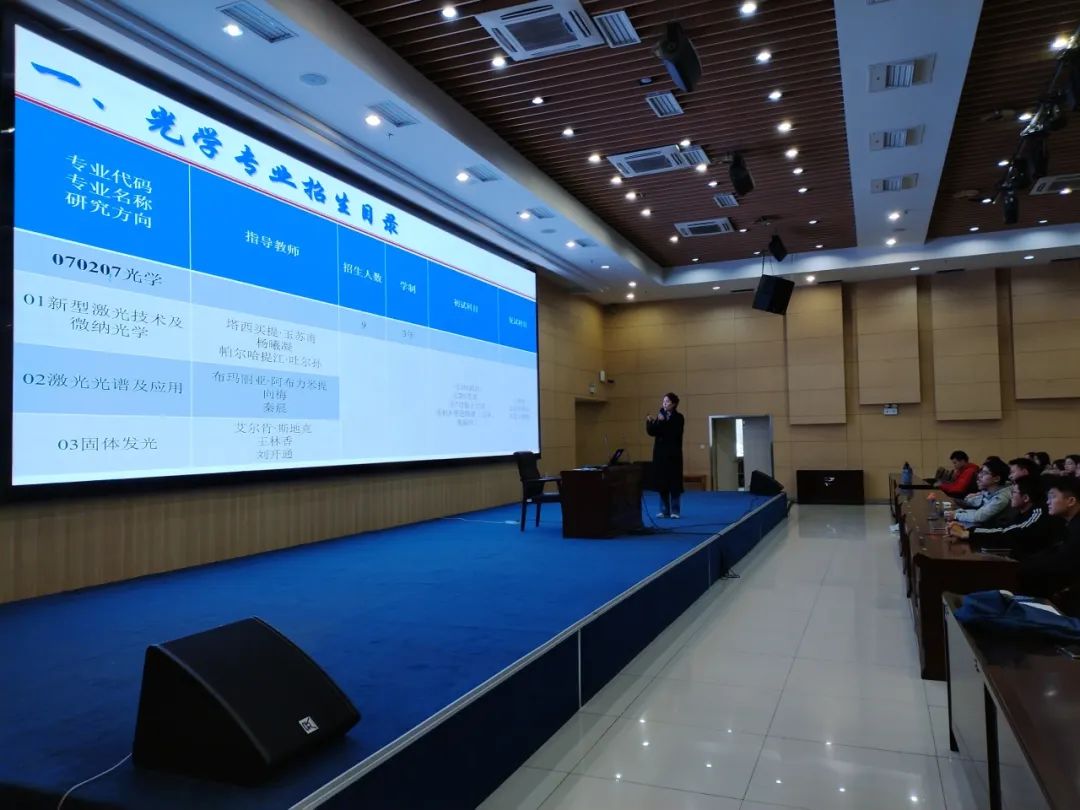 之后,光学、凝聚态物理、理论物理、无线电物理、学科教学(物理)专业的研究生代表玛木合·叶尔兰、牟元恒、阿曼妮萨·阿卜杜瓦伊提、王一帆、杨天奇五位同学结合自身经历与同学们分享了有关入学考试科目、研究方向、研究平台、师资力量及就业情况等方面的内容。
