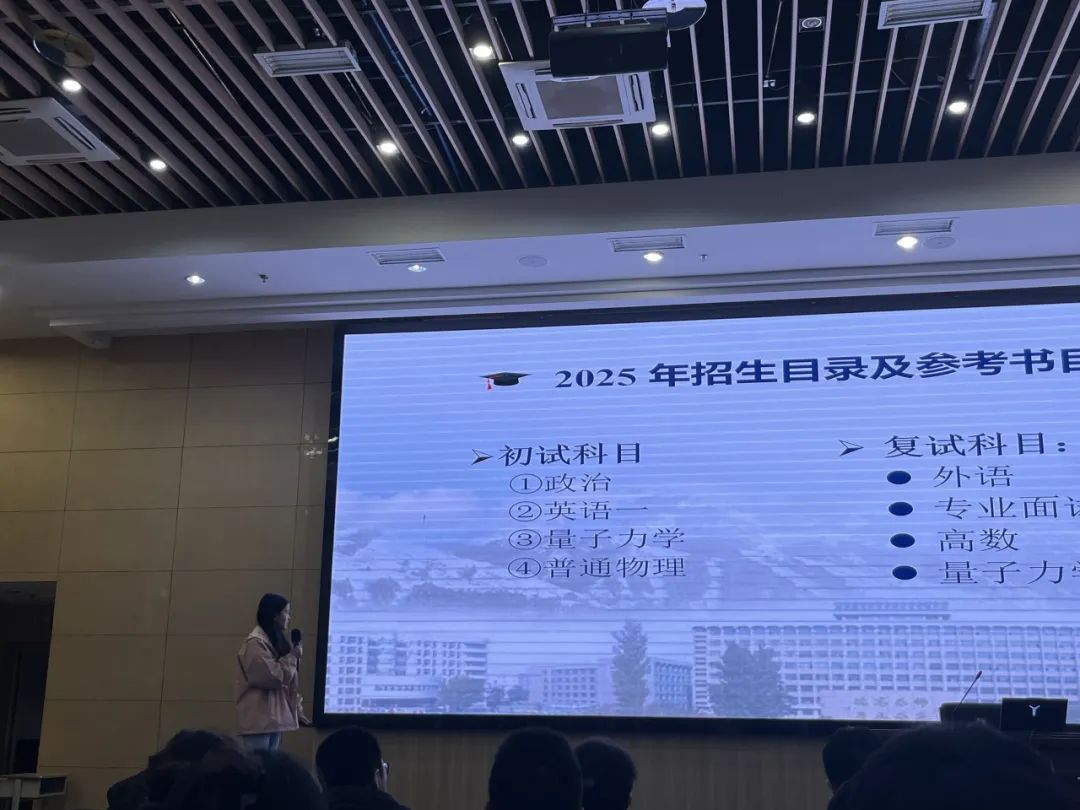 为进一步提升学院研究生生源质量,提高毕业生研究生报考率,为考研学子提供支持和帮助,4月17日,taptap点点体育在国教楼一楼会议室举行2025年研究生招生宣讲会。会议由物理系主任帕尔哈提江·吐尔孙教授主持,2025届150余名学生参加。、