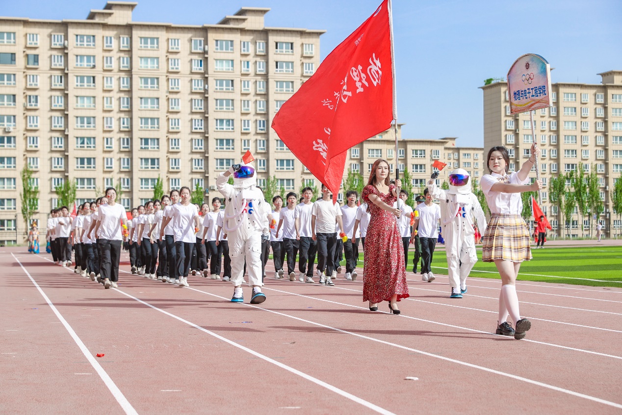 物电学子自信满满,热情高涨,步伐整齐,精神饱满。在中国航天火箭模型的映衬下,学生们纷纷挥舞着手中的扇子,仿佛是在演绎着熊熊燃烧的火焰。这一幕象征着他们如同火箭一般,勇往直前,充满了青春的活力与激情。