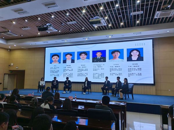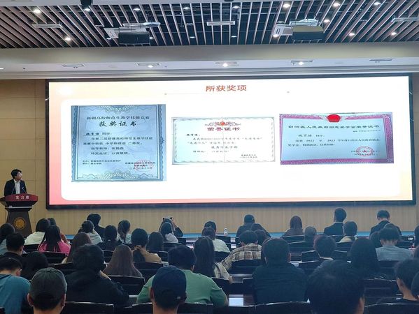 会议邀请了2024届毕业生中已就业和升学的6名学长学姐进行分享。签约中国民航新疆空管局的电子信息科学与技术20-5班刘乐建议大家首先要明确自己的目标,之后可以多咨询学长学姐,利用好身边的资源,要敢于尝试不要害怕失败。考取“硕师计划”的物理学20-1班魏育慷介绍了推免条件以及自身的经历,并强调大家一定要明确目标,努力去向它靠近,克服困难,勇敢拼搏。考取山东大学硕士研究生的物理学20-4班翟西洋讲述了自己的考研经历和大学四年获取奖学金的学习经验,并分享了自己在备考时的方法和技巧。考取和田地区选调生的物理学20-1班伊卜拉伊木江·依马木山介绍了报考选调生所需条件和相关注意事项,并向大家分享了自己考选调生的经历和经验。签约库尔勒华山中学的物理学20-4班闫诗卓强调了简历准备的重要性,并建议大家要多关注相关招聘信息并做好充分的试讲准备。考取taptap点点体育硕士研究生的物理学20-1班窦凤怡分享了自己的考研复习准备和考取本校的优势,并针对考研的科目展开了详细的备考讲解。互动答疑环节,在场的同学们根据自己的实际情况和求职意愿踊跃发出提问,学长学姐分别就问题认真回答,鼓励同学们要敢于挑战自己,积极面对未来道路上的困难。