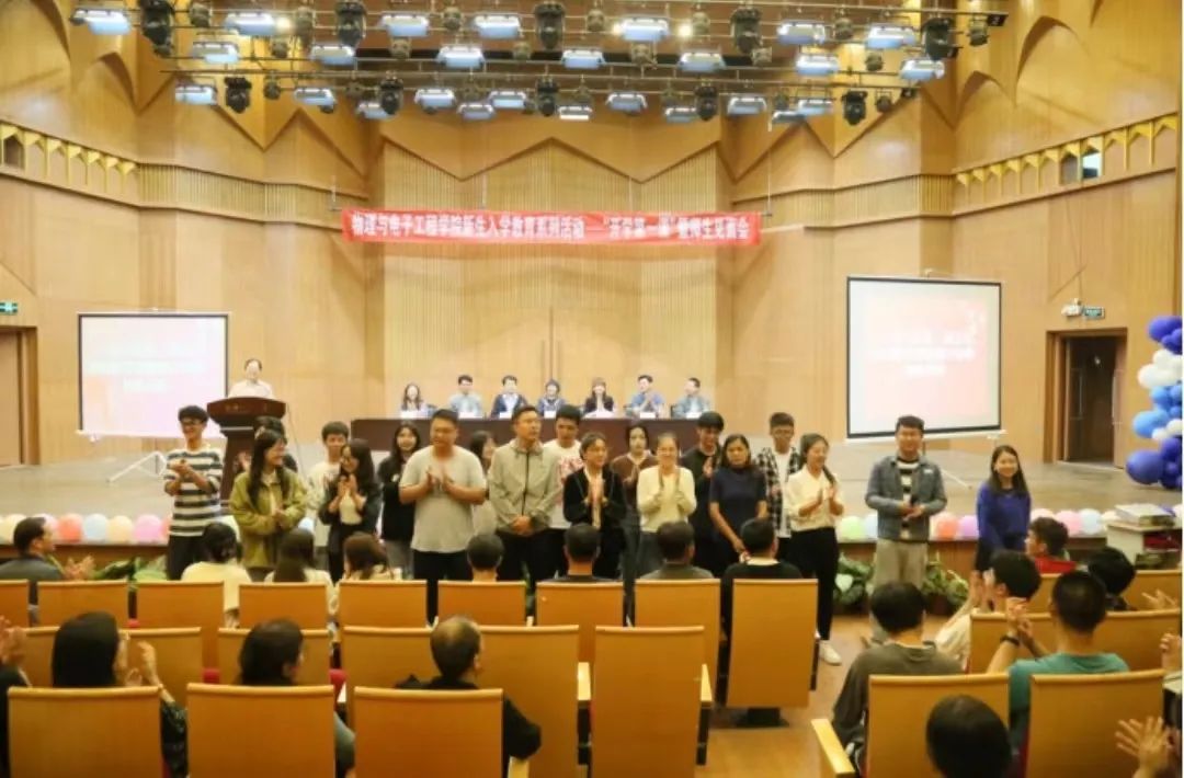 在硕果飘香的金秋时节,物电学院迎来了朝气蓬勃的2023级新生们,师生见面会在雄壮的国歌声中拉开序幕。为表达对新同学们的热烈欢迎,学院全体辅导员、2023级班主任、2023级青葵助励小导师依次为新同学们送上祝福,物理系主任帕尔哈提江·吐尔孙老师、电子系韩振华老师分别从专业建设、机构设置、人才培养、科学研究、学科方向、导师队伍、就业前景等方面为2023级新生做了物理学专业、电子信息科学与技术专业的详细介绍。最后,学院党委副书记、院长向梅对全体2023级新生寄语,她希望同学们,一要打牢学业根基,在“厚德明志格物创新”中把握人生航向;二要锻造坚韧不拔的毅力,保持人生定力;三要牢记自己的初心和坚守,加强自我约束、自我管理、诚实守信,树立积极向上的人生态度。牢记习近平总书记的嘱托“让青春在全面建设社会主义现代化国家的火热实践中绽放绚丽之花。”