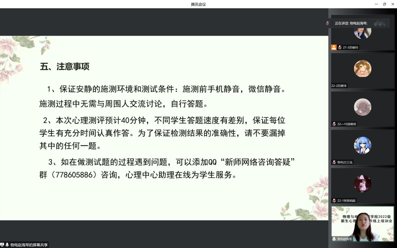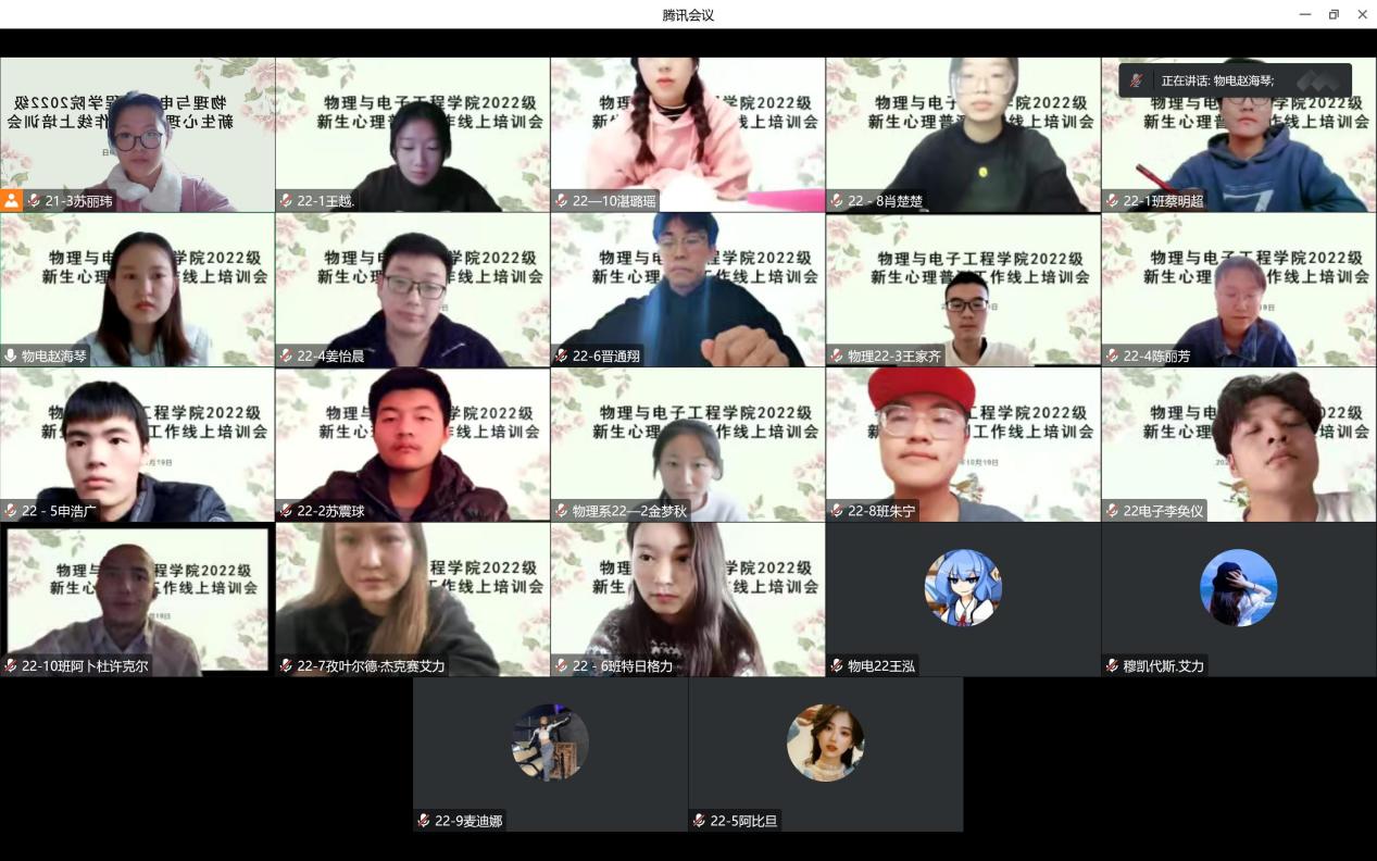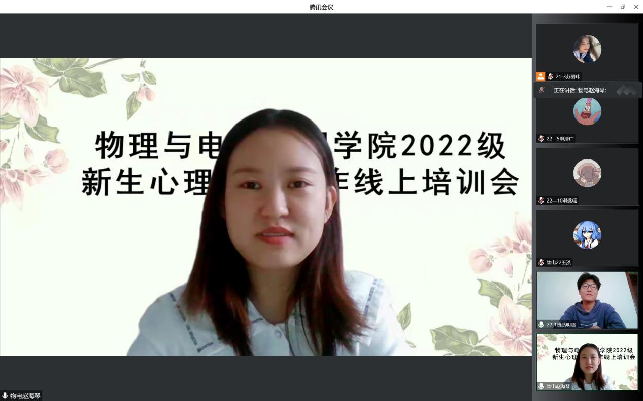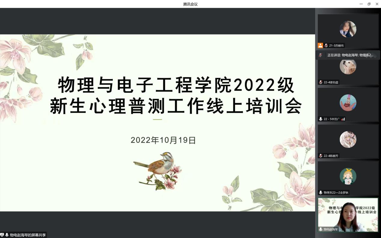 为全面了解和把握我院2022级新生整体的心理健康状况,全面推动新学期我院心理健康教育工作的发展,进一步提升我院大一年级心理委员在心理健康教育工作中的积极影响,我院于10月19日下午16:00在腾讯会议线上开展了2022级新生心理健康普查培训暨2022年秋季院级心理委员培训会。