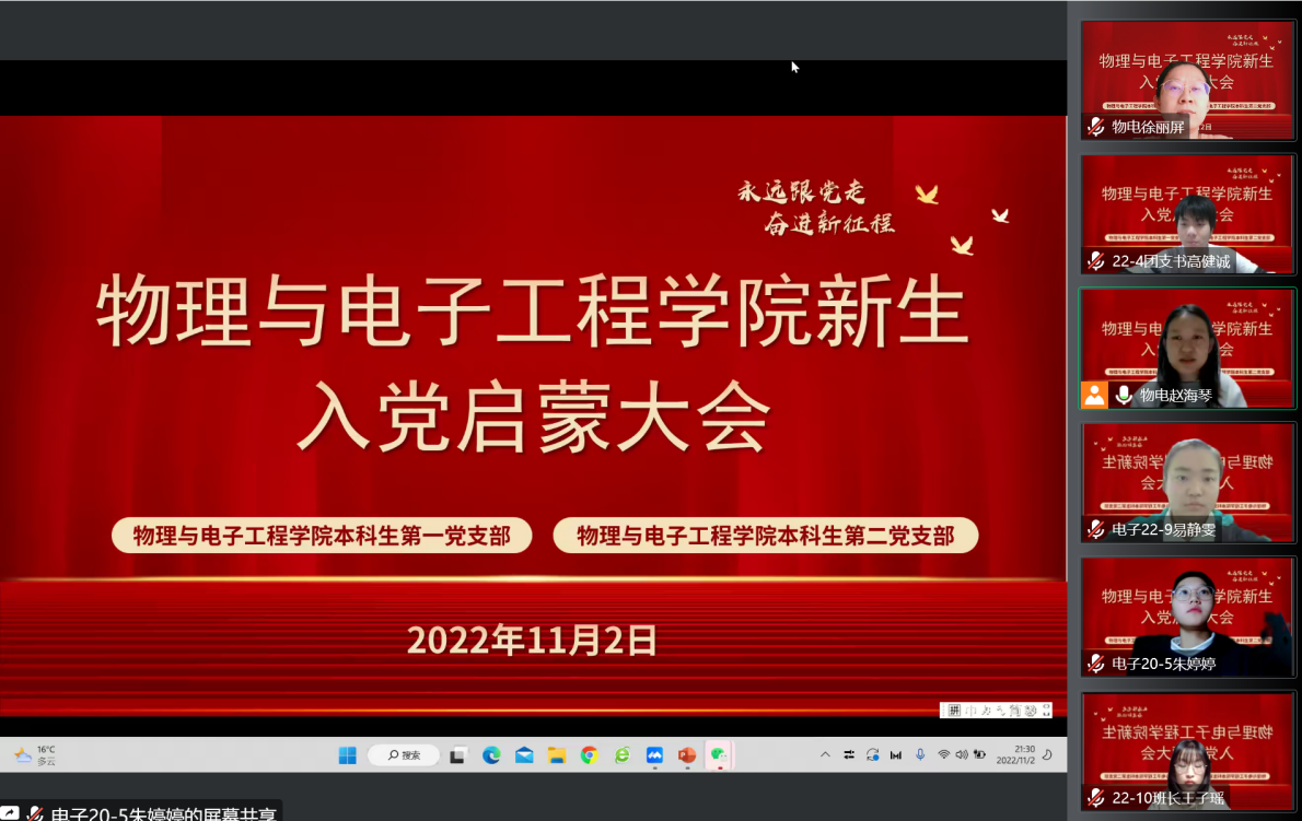 为落实立德树人根本任务,深化大学生理想信念教育,引领新生扣好入党“第一粒扣子”,实现党员发展早选苗、早教育、早衔接、早培养,引导新生提高政治觉悟与思想素质,积极向党组织靠拢。11月2日,taptap点点体育党委开展了“青春与信仰同行”为主题的新生入党启蒙教育系列活动。活动由院党委组织员、本科生第一党支部书记赵海琴主持,党委副书记、纪委书记买星,学工办老师及2022级全体新生参加。