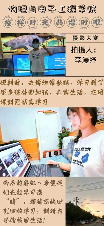 此次活动为丰富同学们疫情下的学习生活,缓解、消除负面情绪搭建了交流与展示的平台,也为摄影爱好者提供了展现自我的平台。通过活动,不但激发了学生的摄影兴趣以及想象力、创造性、艺术感,也让学生通过记录自我成长心路学会在焦虑与不适中更好地调节学习和生活节奏。