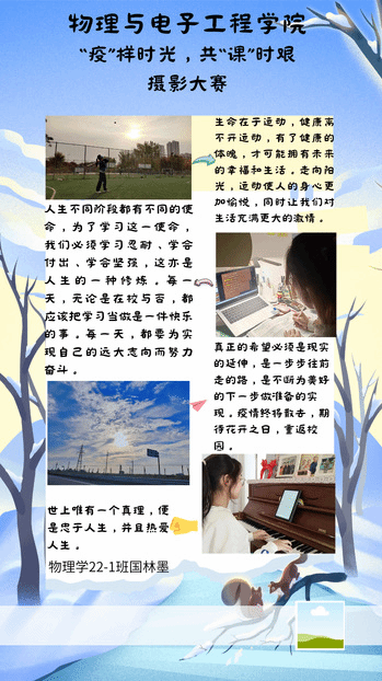 本次活动由学院分团委学生会发起,首先制作了宣传海报在学院班长群和微信朋友圈积极宣传活动,营造了良好氛围。活动一经发出,受到很多同学的热情参与。有的同学用照片展示了“最美逆行者”的背影;有的同学用照片展示了认真听课的状态;有的同学用照片展示了家乡的美景。据统计,本次摄影大赛共收到投稿视频10余个,照片图50余张。
