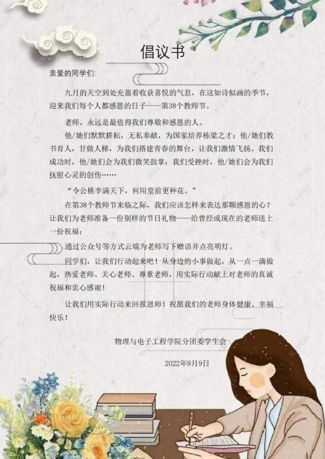 2022年9月10日是第38个教师节,在教师节来临之际,为营造“感恩师,敬师道”的校园文化氛围,taptap点点体育分团委学生会于2022年9月4日至9月10日组织全院学生开展了“感念恩师·为教师亮灯”活动。