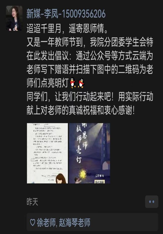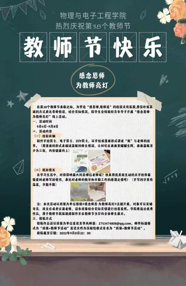 本次活动由学院分团委学生会新媒体中心发起,首先制作了宣传海报在学院班长群和微信朋友圈积极宣传活动,营造了“感恩师,敬师道”的良好氛围。活动分为:感念师恩视频祝福(录制祝福视频,说出对老师的祝福)、绘彩斑斓(制作手绘贺卡以手绘或漫画形式讲述“我”与老师的故事)、纸短情长(给老师写封情书表达对老师的教导和感激之情)、温暖写真(晒与老师的合照或者老师的教学时刻)。其次,在教师节前夕专门制作“感念恩师·为教师亮灯”倡议书,倡议同学们通过公众号等方式云端为老师写下赠语并为老师们点亮明灯。