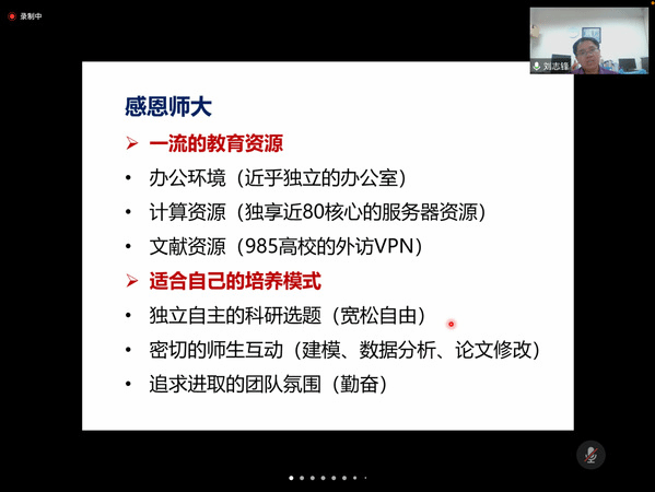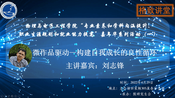 为提升学科内涵建设,加强学生专业素养养成,坚定学生的科研信心,同时鼓励本硕学生做好职业生涯规划,激发同学们的学习热情,助力同学们卓越成长。taptap点点体育于2022年4月29日晚20:00特邀内蒙古大学物理科学与技术学院教授,研究生导师刘志锋教授回访母校交流,带来主题为“微作品驱动-构建自我成长的良性循环”线上精彩讲座,学院老师、全体研究生和本科生积极参加,本次活动由院研究生会承办,副院长戴鹏鹏主持。