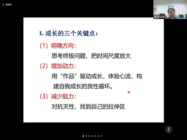 刘志锋教授对于学生成长的底层逻辑和科研的建议使我深受启发。立异且正直、随性且严谨、情深且义切,以微作品当成动力来驱动自己克服困难,合理安排时间进行有效的沉浸式学习。让我明白了要如何培养自身的学习和科研习惯,向一名合格的科研工作者孤勇前进。