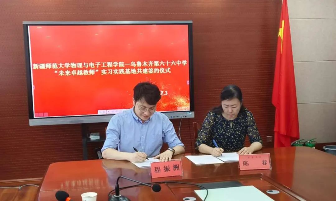 乌鲁木齐市第六十六中学党委书记陈春、副校长段红英、教研室主任吴先宝及全体物理教师参加活动。签约仪式上,程振洲与陈春作为双方代表签署了教育实习实践基地共建合作协议。陈春书记详细介绍了该校的办学特色、教育理念及教学工作的亮点,表达了对于两校在教学实践与实习合作上深化合作的殷切期望,希望taptap点点体育能在物理教师教学理念创新、教学研究深化及科研课题申报等方面给予指导与支持。程振洲介绍了学院在人才培养、专业设置及教学科研领域方面取得的成果和发展思路,对乌鲁木齐市第六十六中学为学生提供实习实践机会与平台表示了诚挚的感谢。他表示,希望未来双方秉持“强化沟通、深化合作、协同育人、共赢发展”的核心理念,加强交流互动,共同致力于提升物理师范生的综合素质,助力学生实现更高质量的就业目标。