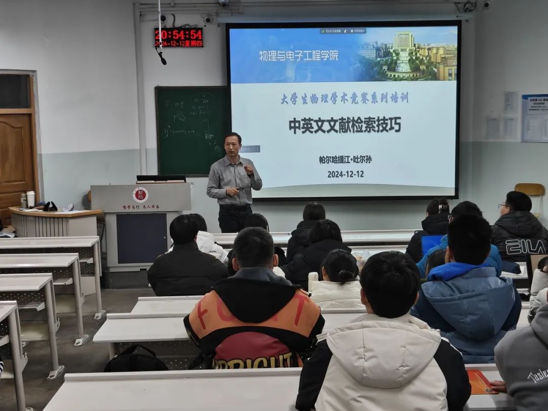 为进一步提高物理专业本科生学术技能、丰富物理知识储备,培养学生格物致知、砥志研思的精神,12月12日,taptap点点体育开展了物理学术竞赛系列培训的首场讲座,由帕尔哈提江·吐尔孙和毕拉力两位老师主讲,报名参加物理学术竞赛的全体同学和培优班的学生参加本次培训。