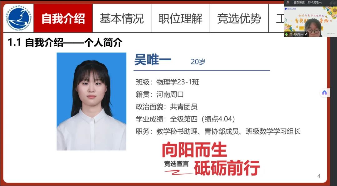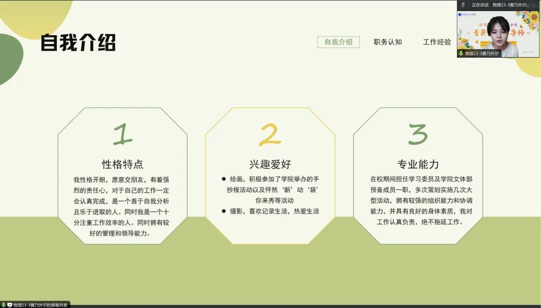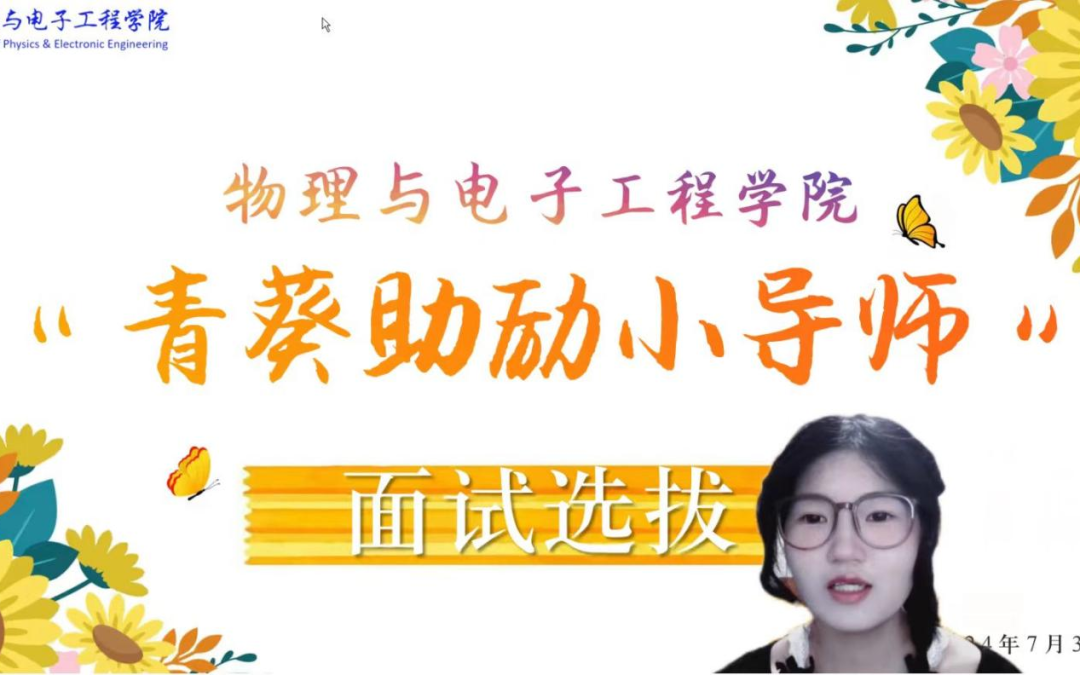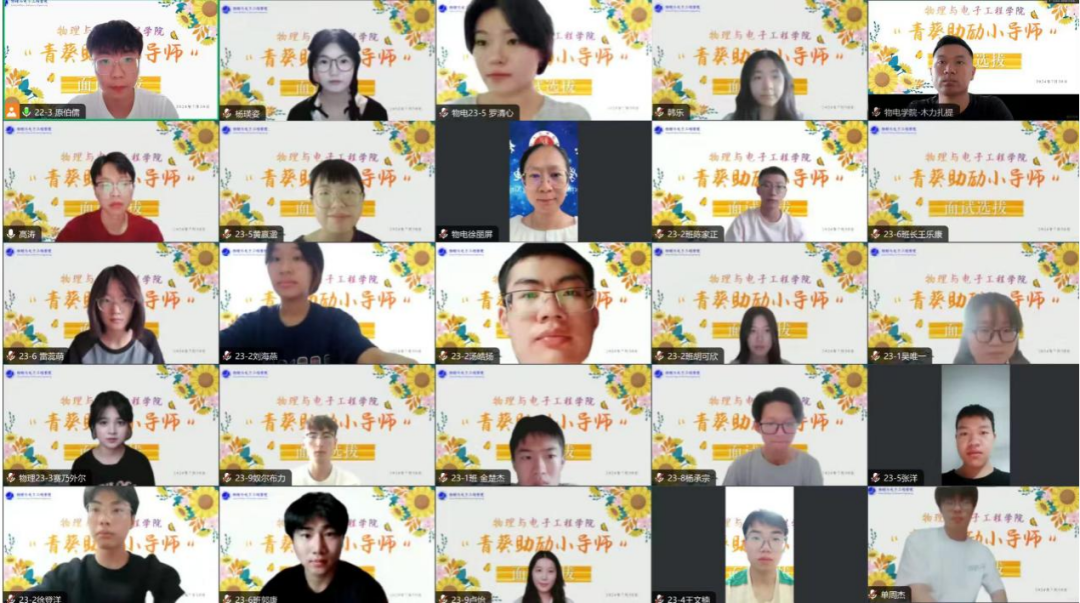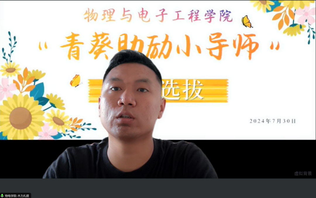 为丰富学院“三强班级”“三好宿舍”创建活动内涵,推进学风建设,充分释放互助成长的朋辈效应,引导2024级新生更快更好地适应大学生活,7月30日,taptap点点体育在线上举办了“青葵助励小导师”面试选拔活动。taptap点点体育党委书记李莉、党委副书记、纪委书记买星、学工办主任徐丽屏、分团委书记木力扎提·马合木提、辅导员宁静、郑叶、周丽茹担任本次活动评委。