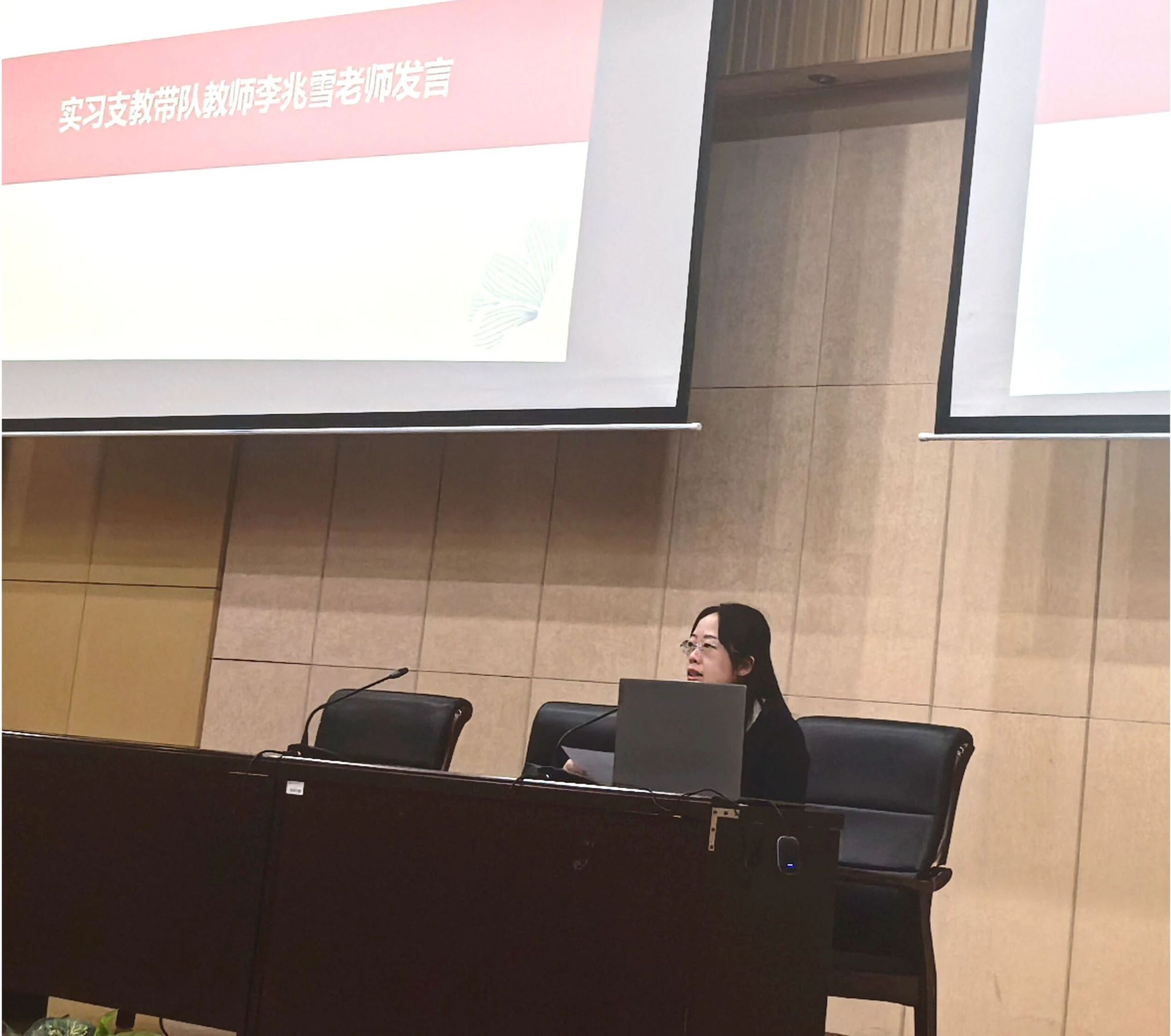 带队教师李兆雪系统回顾了实习同学在实习期间的成长历程,她谈到,同学们从初登讲台的青涩到渐入佳境的从容,完成了由理论学习向实践体验的关键跨越——在真实的教学场景中,大家不再只是书本知识的接受者,而是在备课、授课、反思的循环中,将教育学原理、心理学知识转化为应对课堂生成问题的智慧;在知识向能力的转化过程中,同学们通过一次次独立备课、作业批改、课后辅导,将固化的知识点转化为灵动的教学行为,实现了从"懂不懂"到"会不会"的质变;更重要的是,在实习期间的身份转变中,同学们褪去了作为学生的被动与依赖,逐渐建立起教师的职业认知与专业自觉,深刻体会到"教师"二字背后沉甸甸的责任与担当。她高度认可大家在教学方法上的创新探索,如多媒体手段的巧妙运用、互动式课堂的生动实践,并就强化班级管理能力培养、完善经验交流机制等提出建设性意见和建议,希望同学们以此次实习为起点,在未来的教育道路上继续深耕细作,用爱与智慧点亮更多学生的成长之路。